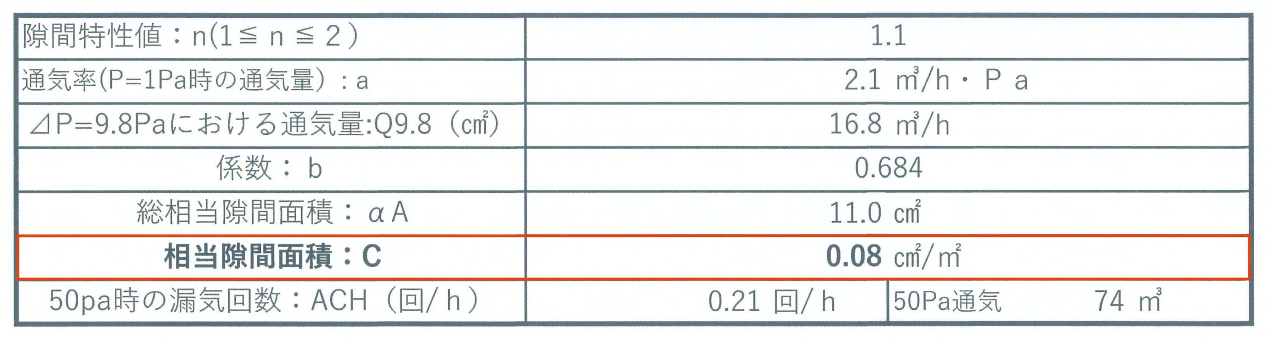 C値(相当隙間面積)は、延床面積1㎡あたりにどれだけ隙間があるかを表すもので、単位は「cm²/㎡」です。減圧法の測定で、C値1.0㎠/㎡を切ると気密住宅と一応言われておりますが、高性能住宅では0.5㎠/㎡以下を基準の目安にしておく必要があります。ちなみに、パッシブハウス基準では、0.2㎠/㎡以下が基準となります。