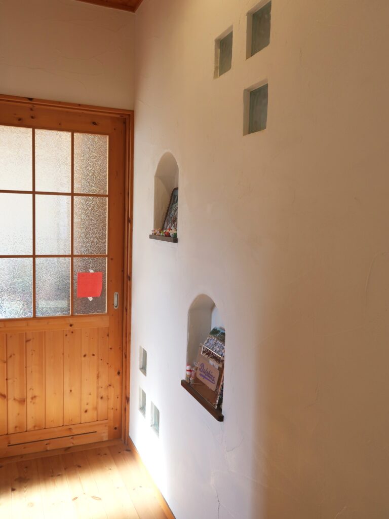 漆喰壁の質感が良いですよ。収納は多いに越したことはないので、オープン棚よりも隠せる収納を多くした方がスッキリとして良いかもしれません。